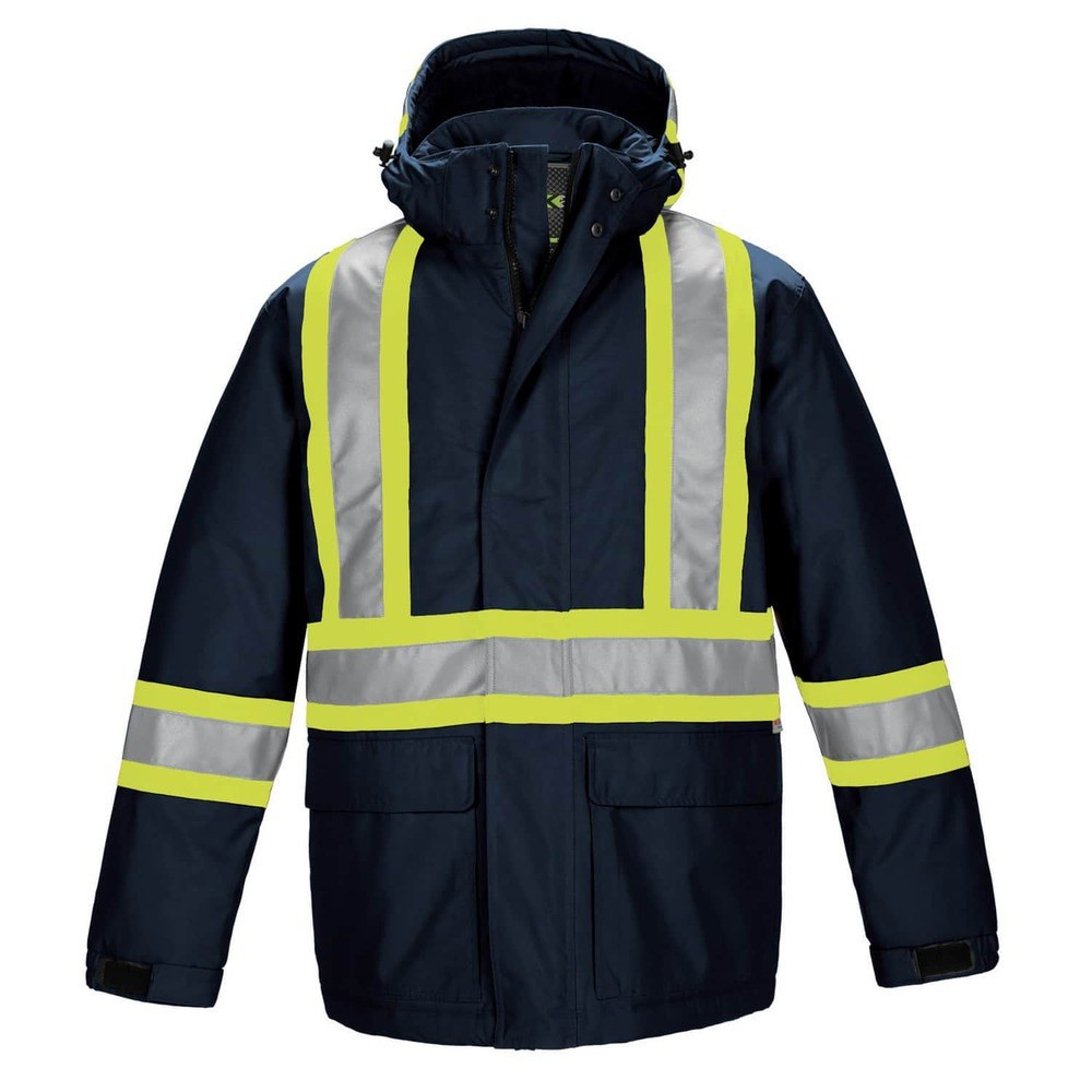 Introducing the ultimate in outdoor workwear, the Armour Polyester Canvas Hi-Vis Parka, meticulously designed to offer unparalleled protection and visibility in challenging environments. Crafted from a robust 215 gsm (6.3 oz./yd2 – 10.5 oz./lin. yd) 100% polyester oxford fabric, this parka boasts an impressive 3000 mm waterproof rating coupled with a 3000 gsm breathability rating, ensuring you stay dry without sacrificing comfort. The wind-resistant and water-repellent finish shields you against the elements, while the heavy-duty polyester canvas construction with taped waterproof seams enhances durability and longevity. Experience warmth like never before with the full-body thermal quilted insulation, featuring 220 gsm in the body and 170 gsm in the sleeves, all made from 100% polyester for maximum heat retention. A detachable thermal-lined hood offers additional versatility and protection. The parka is equipped with a reliable YKK zipper on the front fly, secured with a storm flap and hidden dome snaps for added safety. Storage is ample with oversize patch pockets with flaps and an inner zipper pocket for valuables. The drawcord on the hem and adjustable tab closure on cuffs allow for a customized fit, ensuring greater mobility and comfort. The brushed tricot pocket lining and rib knit storm cuff add layers of warmth and protection. Visibility is paramount, and this parka delivers with a 4” hi-vis contrast band complemented by 2” 3M reflective tape on the front, back body, and sleeves, meeting CSA standards for high visibility. Whether braving the storm at work or navigating the great outdoors, the Armour Polyester Canvas Hi-Vis Parka is your shield against the unpredictable, blending functionality with safety in every stitch.