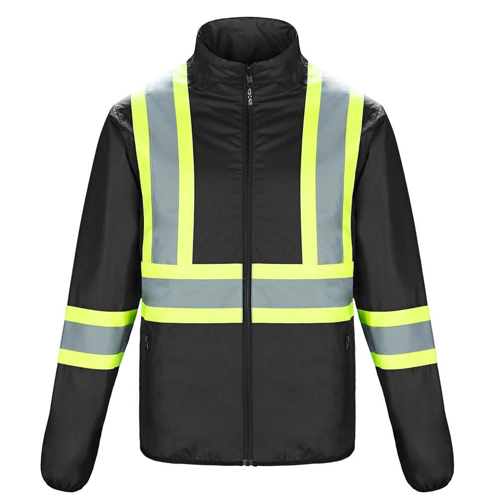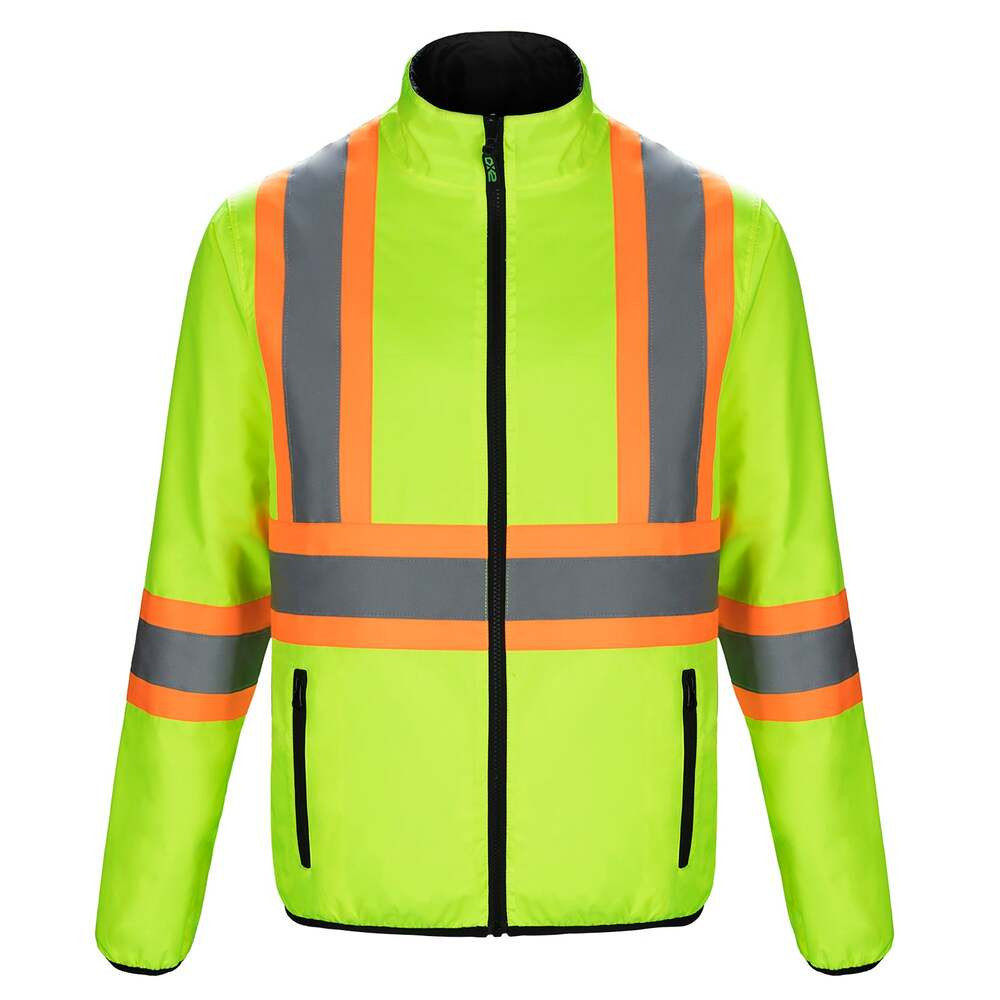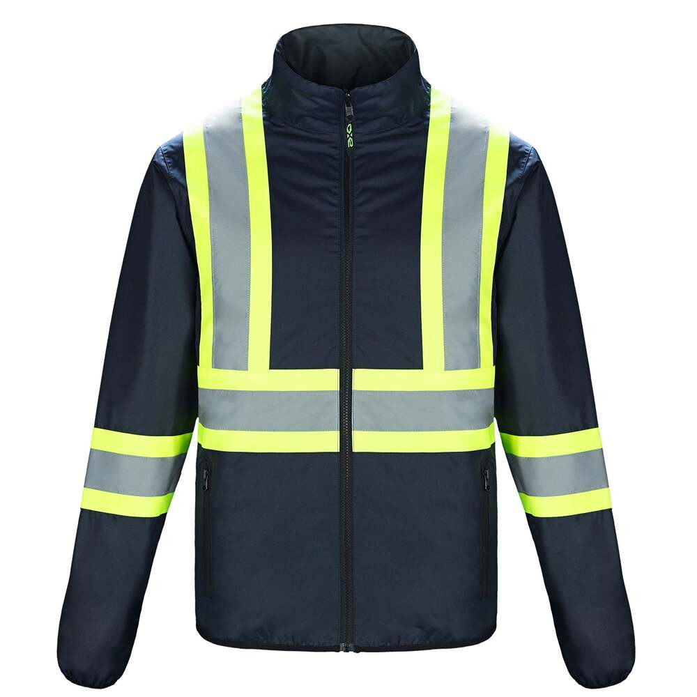 4” hi-vis contrast band with 2” reflective tape on front and back body and sleeves.