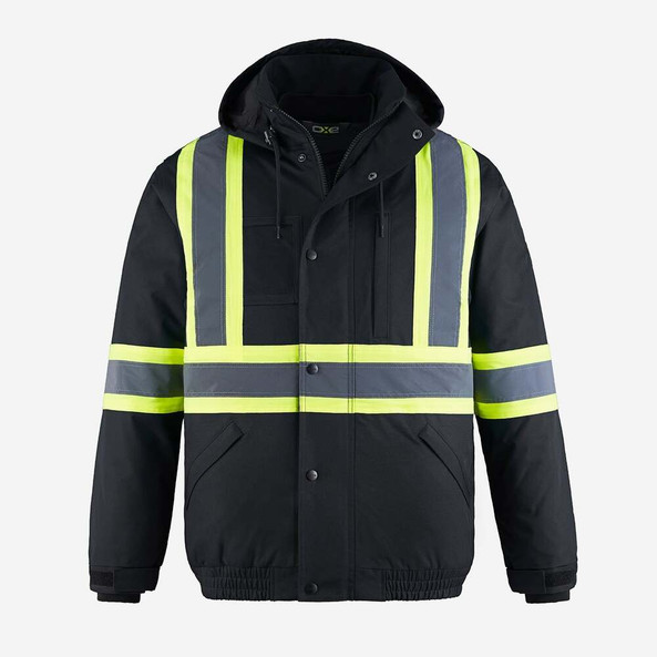 Introducing the Peterbuilt 3 In 1 Hi-Vis Bomber Jacket, a versatile and robust addition to your outdoor or workwear wardrobe. Designed to tackle harsh weather conditions head-on, this jacket combines functionality with durability. The outer layer is crafted from a sturdy 215 gsm, 6.3 oz./yd2, 10.5 oz./lin yd 100% polyester oxford fabric, boasting a 3000 mm waterproof rating and a 3000 gsm breathability rating. Its wind-resistant and water-repellent finish ensures you stay dry and comfortable in unpredictable weather. The inner jacket, made from a lightweight 68 gsm, 2 oz./yd2, 3.5 oz./lin yd 100% polyester taffeta, also features a wind-resistant and water-repellent finish, providing an additional layer of protection. The insulation layer, consisting of 180gsm 100% polyester, offers warmth without the bulk. The outer jacket is fully seam-sealed with a waterproof, breathable coating, and includes a snap detachable hood with an adjustable drawcord for a customizable fit. Practicality is key with a chest zipper pocket, ID pocket, and lower front welt pockets with zipper closure for secure storage. Adjustable tabs on the sleeve cuff, two inner patch pockets, and Zocket embroidery access add to the jacket's functionality. The zip-out insulated quilted inner jacket can be worn alone or together with the outer shell for maximum warmth. A rib-knit collar and cuff, along with patch pockets on both the exterior and interior of the inner jacket, provide comfort and convenience. The jacket features YKK zippers for reliability. Visibility is enhanced with a 4” hi-vis contrast band with 2” reflective tape on the front, back body, and sleeves, meeting CSA standards for safety. Whether for work or leisure, this bomber jacket is designed to keep you warm, dry, and visible in all conditions.