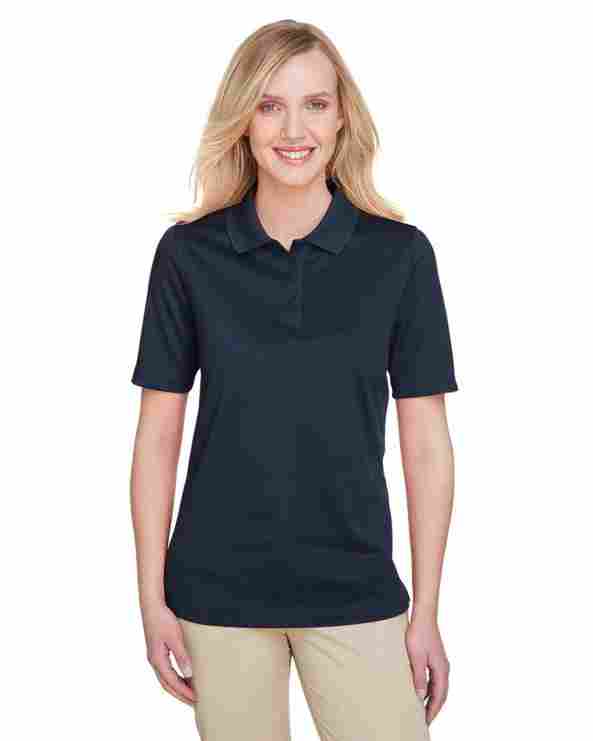 6.6 oz./yd2 / 225 gsm, 100% polyester jersey; Snag protection plus; Moisture-wicking; Antimicrobial performance; UV protection; Matching flat knit collar; Side vents; 4-button placket with dyed-to-match buttons; Narrow placket for femine look; Industrial Laundry Tested to 75 washes