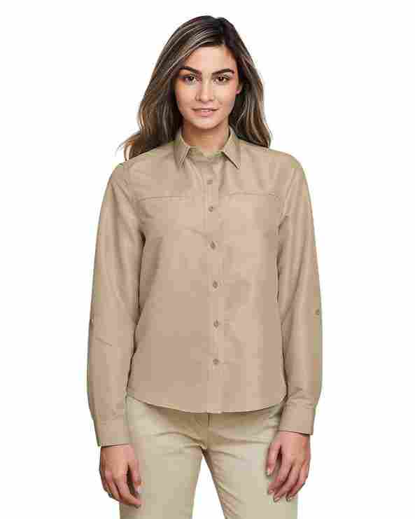 3.5 oz./yd?/115 gsm, 100% polyester ripstop; Lining is 100% polyester mesh in upper back; Moisture-wicking, antimicrobial and UV protection performance; Structured collar with integrated collar stays; Full-button front; Back venting for breathability; Chest pocket with pen slots; Easy care