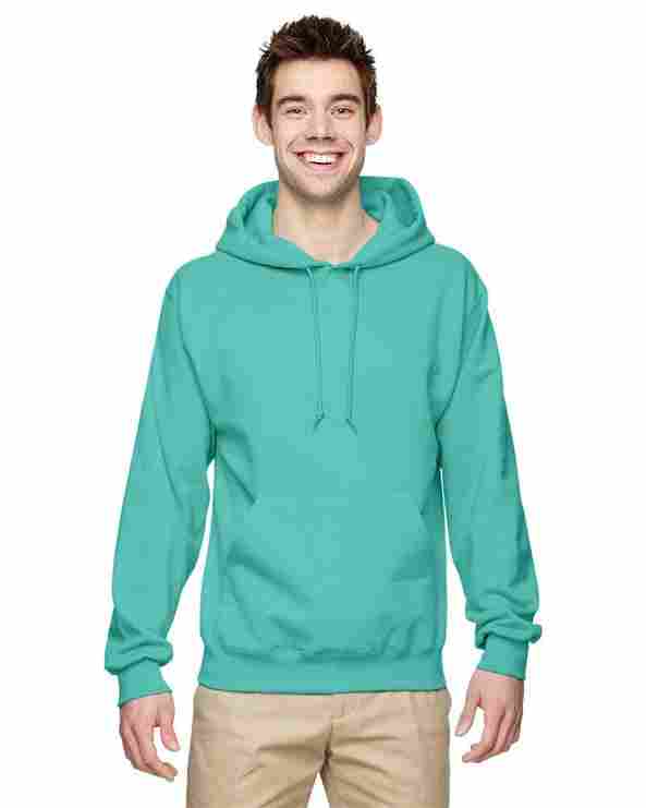The JERZEES 996MR is hooded sweatshirt made of a 50/50 blend of cotton and polyester. It features double-needle stitched at stress points, a front pouch pocket, a two-ply hood with grommets and drawstring, concealed seams on cufs and a seamless body with set-in sleeves.