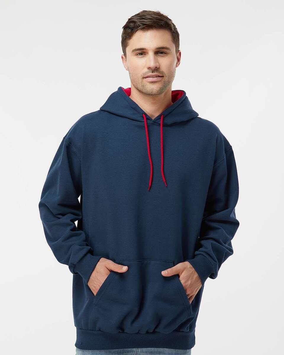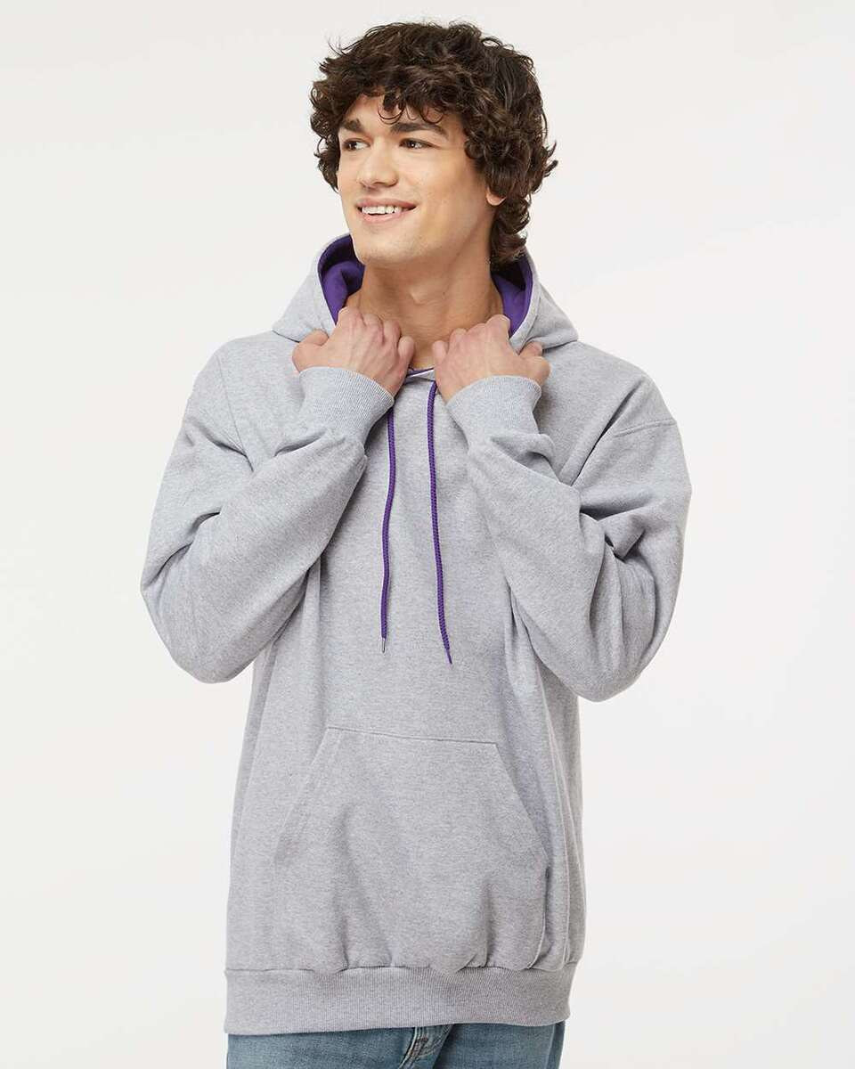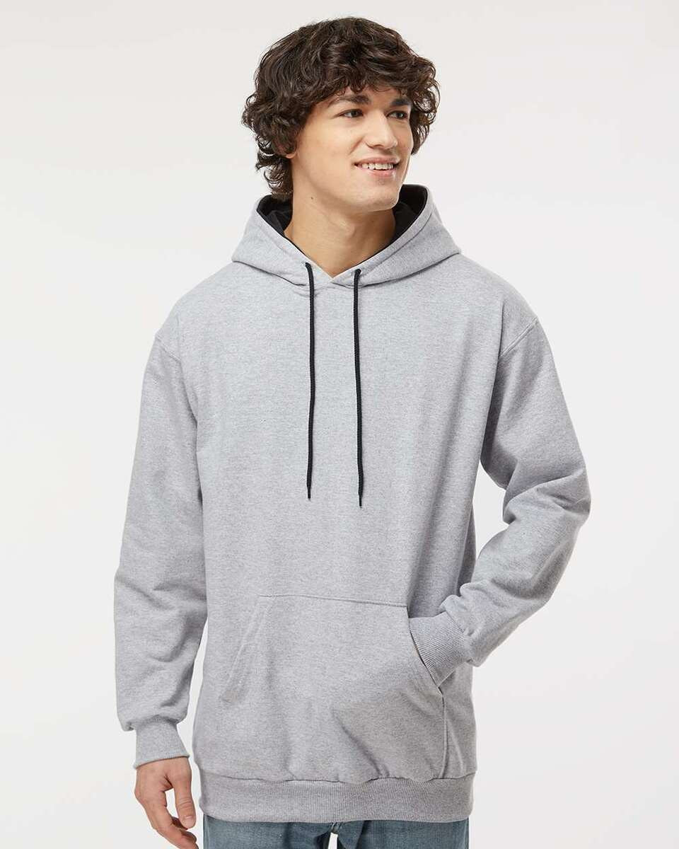 95% Cotton/ 5% polyester, 15 oz. 2x1 Rib cuffs and waist (95% cotton, 5% lycra). 2-ply hood with inside contrast. Contrasting drawcord. Double-needle coverstiching on neck and armhole. Pouch pocket. (sport grey 25% polyester, charcoal 50% polyester)