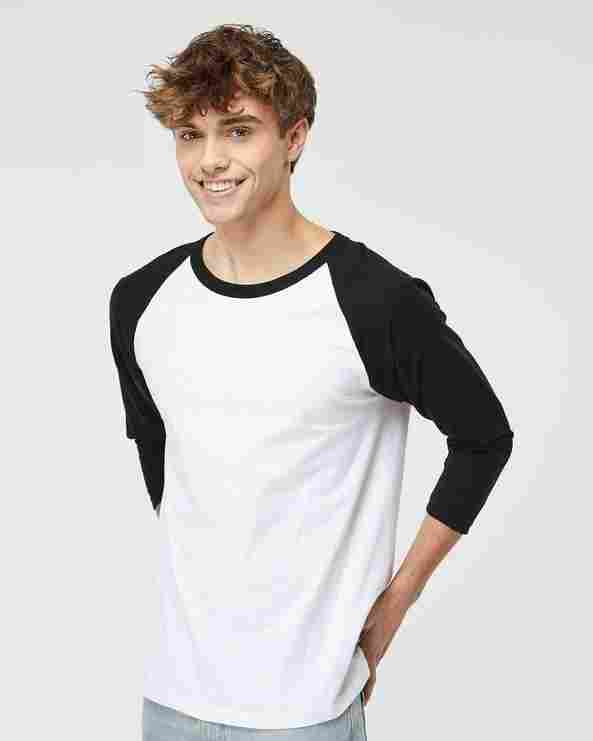 100% Cotton preshrunk jersey ring spun 9.4 oz. 3/4 Sleeves, contrasting neck rib 1X1. Double needle sleeve and bottom hem.(sport grey body 10% polyester)